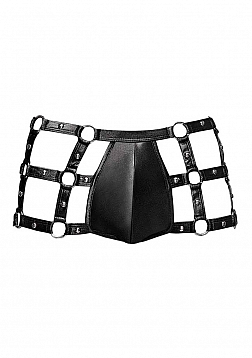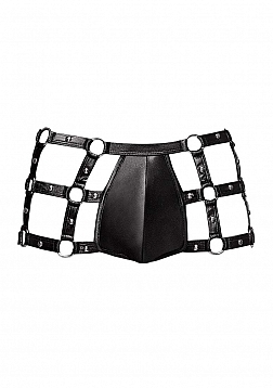 From the Fetish collection by Male Power, this style includes: A cutout cage short featuring studded fabric straps with metal rings.