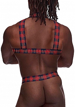 From the Elastic Harness collection by Male Power, this style includes: A harness featuring bands trimmed with metal studding, adjustable metal clips and a detachable waistband with a snap-off silicone rubber cock-ring.