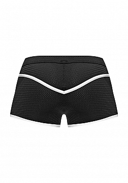 From the Sport Mesh collection by Male Power, the Sport Mini Short, features a stay put fabric covered waistband with a logo'd MP tag. Plush elastane sporty striping highlights the front, rear and legs