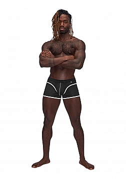 From the Sport Mesh collection by Male Power, the Sport Mini Short, features a stay put fabric covered waistband with a logo'd MP tag. Plush elastane sporty striping highlights the front, rear and legs