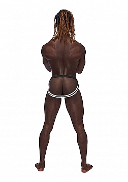 From the Sport Mesh collection by Male Power this style, the Sport Jock, features a stay put fabric covered waistband with a logo'd MP tag. Plush elastane sporty striping highlights the front, and rear leg bands. Full rear exposure.