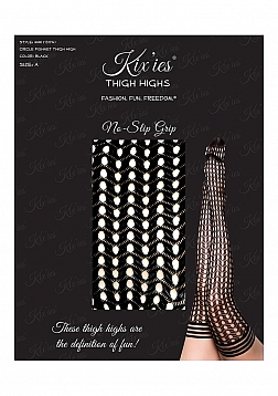 Kix'ies unique black circle fishnet. These thigh-high's aren't for the faint of heart and are sure to turn a head or two! Kix'ies thigh-highs are designed for all-day wear, with a no-slip-grip. We offer Petite to Plus Size Stockings and are the #1 thigh-highs that actually stay up!