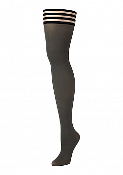 Kix'ies grey opaque thigh-high tights. Our Sierra thigh-highs are such a fun addition to your wardrobe, adding a bold yet soft flare to any outfit! We love this style for our fall and winter seasons. Kix'ies thigh-highs are designed for all-day wear, with a no-slip-grip. We offer Petite to Plus Size Stockings and are the #1 thigh-highs that actually stay up!