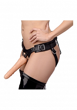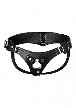 This enticing corset back dildo harness will look absolutely stunning on almost any body type! With adjustable buckles at the hips, sliding D-ring buckles at the buttocks, and a lace up corset style closure at the back, you can find your ideal fit. The corset back arches and curves around your body, creating an irresistible heart shape. The front has an open hole with three snap straps that support the metal O-ring.