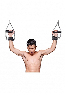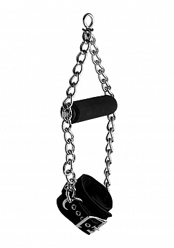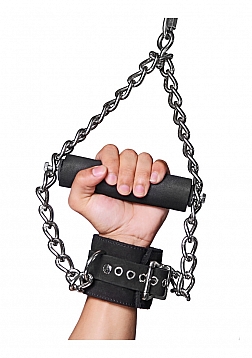 These heavy duty suspension cuffs have a built in handle, for maximum security and long term wear. The Nubuck leather has a soft appearance, with man made fur lining the cuffs adding extra comfort. The handle is crafted from wood wrapped in an easy grip foam, attached to the outer weight bearing chain. The cuffs can support up to 200 pounds of weight. Fully adjustable with metal reinforced grommets. Just attach these versatile cuffs to your own suspension bar, chain, or rope system, and leave the rest to your imagination.