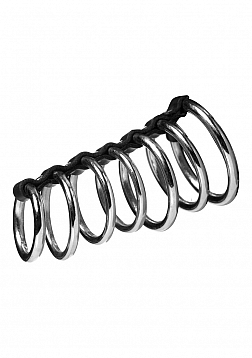 Put your penis in purgatory with the Gates of Hell Chastity device! This chastity devices is made up of a series of 7 nickel plated steel rings, attached together by a leather strap. The first ring is for your cock and the balls the rest of the rings are to secure the penis.