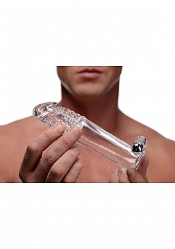 This semi-realistic sex sleeve combines girth, vibration, and texture to your rod for the ultimate in sexual satisfaction. The textured interior increases stimulation and stays put, allowing for a powerful finish. The contoured interior is tight enough for friction. For your pleasure, the Vibro Sleeve is made of clear, ultra stretchy TPR material, so it conforms to your rod. A powerful vibrating bullet comes attached to the base, so you can add sexy clitoral stimulation as you penetrate your partner with your new longer, fatter penis.