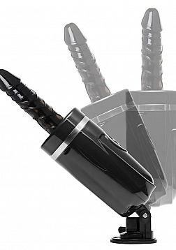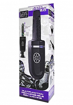 Introducing the Jaxxx Hammer 2.0, an updated design for self-pleasure or adventures with your partner. With four vibration intensities and two new rhythmic settings, you can experiment with further levels of satisfaction with this rechargeable sex machine. Three thrusting speeds allow you to get the pounding you are craving, by either mounting the machine with its swiveling suction cup base, or removing it from the base for hand-held action. Use the boost button to get even more power out of this cordless toy, and for use in the dark, turn on the optional lights and watch them disappear inside you. The phthalate-free dildo is realistically shaped, with veins for enhanced pleasure. Make your fantasies come to life with this vigorous machine from Love Botz.