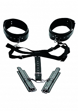 Your submissive lover wants to be even more vulnerable to your desires! Put them in this positioning harness to spread their legs open and keep their wrists trapped behind their back. Four points of adjustability allow you to customize the chest harness to your partners size. The elegant ankle and wrist cuffs are also fully adjustable with the buckles. This comfortable positioning aid can be used during foreplay or sex to pleasure your petÂ… and yourself!