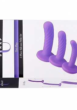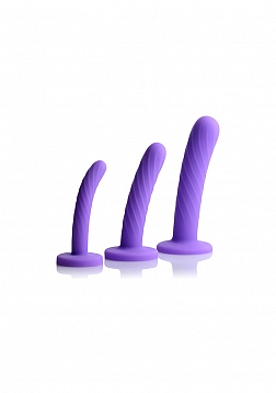 This set of 3 silky, smooth dildos is perfect for getting you accustomed to vaginal or anal penetration. Your tight hole needs to be coaxed and pleasured before it allows entry of a big dick or dildo, so start small with the finger-sized shaft. Subtle swirled ridges protrude for a delicious texture as you insert. Protruding more in the longer and girthier medium-sized shaft, they will massage the walls of your orifice as it slides in. Finally, your body will be ready for the largest of the three dildos. Savor the sensation as it pushes into you! The slight curve on each one will ensure that the right place is stimulated: the P-spot in male ass and the G-spot when used vaginally on a woman. The suction cup bases make them perfect for solo use, sticking firmly to most smooth, hard surfaces. Made of quality silicone material, these purple shafts are firm, yet flexible. The material is non-porous, cleaning easily and effectively with soap and water. Avoid use with silicone lube.