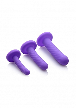 This set of 3 silky, smooth dildos is perfect for getting you accustomed to vaginal or anal penetration. Your tight hole needs to be coaxed and pleasured before it allows entry of a big dick or dildo, so start small with the finger-sized shaft. Subtle swirled ridges protrude for a delicious texture as you insert. Protruding more in the longer and girthier medium-sized shaft, they will massage the walls of your orifice as it slides in. Finally, your body will be ready for the largest of the three dildos. Savor the sensation as it pushes into you! The slight curve on each one will ensure that the right place is stimulated: the P-spot in male ass and the G-spot when used vaginally on a woman. The suction cup bases make them perfect for solo use, sticking firmly to most smooth, hard surfaces. Made of quality silicone material, these purple shafts are firm, yet flexible. The material is non-porous, cleaning easily and effectively with soap and water. Avoid use with silicone lube.