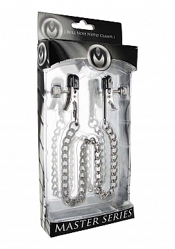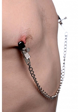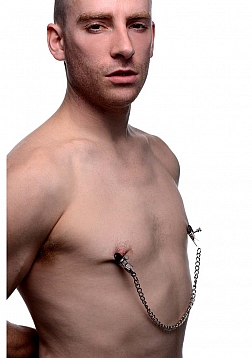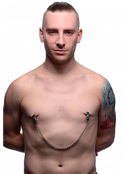 Attached to a single chain, once these bullnose style clamps are affixed to the nipples of your plaything, you can control just how much pleasure or pain they deserve. Simply adjust the level of intensity by turning the screw located near the tip of the clamp. Tips are coated in vinyl for added comfort and safety.
