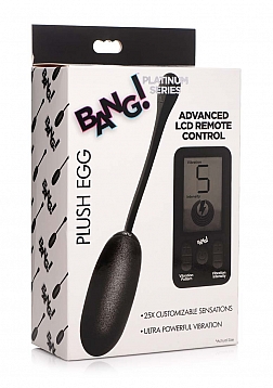 BANG!'s Plush Silicone Vibrating Egg feels like a cloud when inserted with its soft squish material is ultra-comfortable against your body! With 5 different vibration patterns and 5 intensity levels you can mix and match for a combined 25 different combinations of play, giving you plenty of options with when the mood strikes. Insert vaginally for direct G spot stimulation and retrieve easily with its included pull cord. Its hypoallergenic silicone has a sleek metallic sheen that is silky smooth to the touch. This plus sized bullet is waterproof, allowing for play practically anywhere. The illuminating LCD display remote allows you to view exactly what intensity level and vibration pattern you are on even in the dark. The added remote is great for solo use or exciting partner play! Use it in the bedroom or for a night of fun out on the town.
