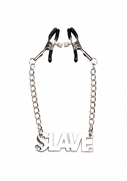 Key Features: Adjustable Pressure: The nipple clamps adjust to the pressure of your choosing by twisting the screw until tightened and secure. Rubber Tips: Protect your sensitive skin from abrasive metal with the rubber tips that cover the ends of the clamps. A Labelled Slave!: The large lettered SLAVE sign is made from nickel-free metal and provides a fun addition to bedroom role playing!
