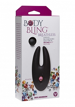 Add some bling to your bedroom with the Body Bling Breathless in SecondSkyn™, an amazingly soft, flexible silicone that warms to the touch and molds to your most sensitive areas. The flexible “bunny ears" shape is perfect for hugging the clitoris or experimenting with other uses, powered by a strong yet quiet motor with 8 unique functions. Breathless is easy to operate too-- just a press of its sparkling gem powers vibrations on and off, and selects your favorite mode. Breathless is completely wireless, and conveniently rechargeable via the included USB cable.