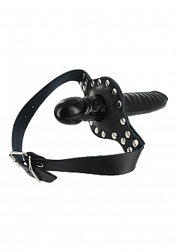 The Ride Me Mouth Gag keeps you stuffed and your partner silent! There is plenty of penetration to go around with a glossy black dildo on the outside, and a cock-shaped mouth gag on the inside. This double dose of dick is supported by a heavy-duty adjustable leather strap that buckles behind the head, and a studded mouth-guard. Fill up their mouth and then climb on and ride!
