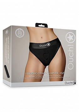 The Vibrating Strap-on Hipster sits high on the hip with an open crotch design and lace details.