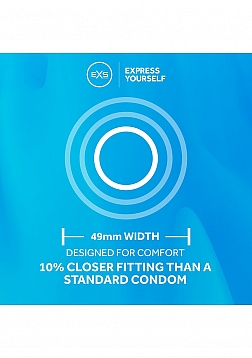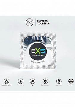 Contains 48 premium latex, EXS Snug Fit Condoms. EXS Snug Fit Condoms are perfect for those with a modest size penis and for those who love a nice, more constrictive fit. Designed to stay firmly in place after ejaculation.