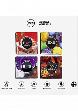 Variety Pack 1 contains 48 condoms in the following varieties: • 6x EXS Black Latex Condoms • 12x EXS Nano Thin Condoms • 6x EXS Ribbed, Dotted and Flared Condoms • 6x EXS Cola Condoms • 6x EXS Chocolate Condoms • 6x EXS Bubblegum Condoms • 6x EXS Strawberry Condoms
