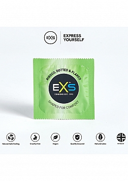 Contains a variety of 48 premium latex EXS condoms. Plain, flavoured, smooth, textured, or ultra-thin? Choosing the best condom is far from easy, and that's where the EXS Variety Pack of condoms comes in!