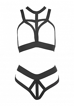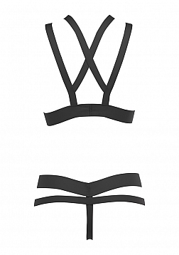 The electric sweet spot between love & lustÂ…For your fantasizing pleasure, elastic straps that hug, sculpt and showcase all of you. Ultra-strappy bra & thong set.