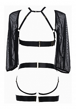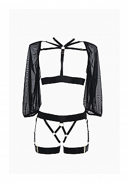 Ibiza Babe is a wild & deliciously beguiling take on sexy. If you are a jet setter or simply a Femme Fatale, this set will make you look & feel incredibly gorgeous. Strappy open front bodice with attached mesh sleeves. Adjustable straps throughout. Fully open panty with adjustable straps and attached garters with leg bands. To garter or not is never a questionÂ…xo