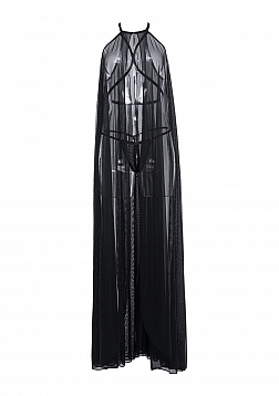 If undressing is an artÂ…then this piece is a masterpiece. This shoulder baring sheer mesh cape is absolutely divine with adjustable criss-cross body straps to contour and highlight your best assets. Definitely a must have for effortless boudoir dressing. Comes with an open front G-string.