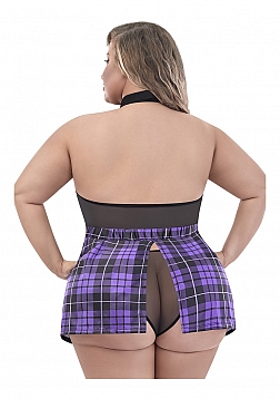 From the Dress Up collection by Magic Silk, this style includes: A baby doll top with a halter neck that has a front neck closure, an open back skirt, a wrap style front, a pair of matching cheeky panties, and a matching tie with a hook closure.