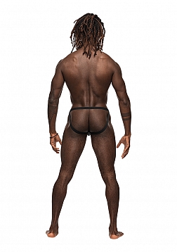 From the Male Power Magnificence collection this style includes a Jock with a cut out window on the waist, decorative metal grommets, and a slim, stay put plush elastic waistband. Butt boosting plush elastic leg bands.