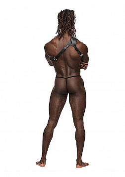 From the Leather collection by Male Power, this style includes a one shouler harness with adjustable strapping, metal buckels, rings and studs.