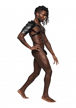 From the Leather collection by Male Power, this style includes a criss crossing chest harness with a gladiator inspired, bendable shoulder shield, fully adjustable buckled straps, metal rings and studs.