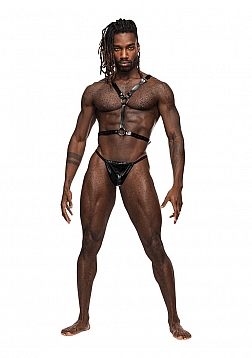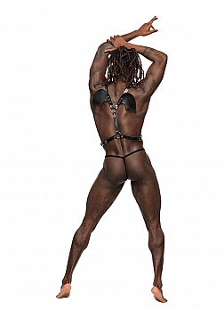 From the Leather collection by Male Power, this style includes a double ring torso harness with adjustable buckled straps and decorative bat wings in back with metal rings and buckles.