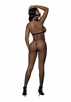 From the women's Leather collection, this style includes an open halter bra with adjustable buckled back and neck choker and a separate adjustable buckled ball clamp mouthpiece with metal nipple clamps, metal rings and studs.