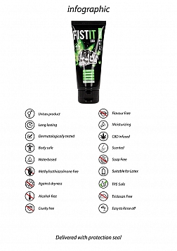 Water-based lubricant. Contains the active ingredient CBD (Cannabidiol). Suitable for use with latex condoms. Dermatologically tested, fat-free, colourless, odourless and tasteless. Directions for use: Apply as much gel as you want on the body part that you want and repeat as often as you like. Keep out of reach of children. Store in a cool, dark place.