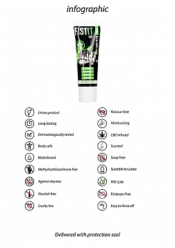 Water-based lubricant. Contains the active ingredient CBD (Cannabidiol). Suitable for use with latex condoms. Dermatologically tested, fat-free, colourless, odourless and tasteless. Directions for use: Apply as much gel as you want on the body part that you want and repeat as often as you like. Keep out of reach of children. Store in a cool, dark place.
