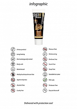 Fist It is a water-based lubricant. Suitable for use with latex condoms. Dermatologically tested, fat-free, colourless, odourless and tasteless. Directions for use: Apply as much gel as you want on the body part that you want and repeat as often as you like. Keep out of reach of children. Store in a cool, dark place.