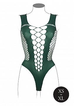 Teddy with a combination opaque and net. It has a deep-V neckline. This teddy has some stretch and can be worn from size XS to XL.