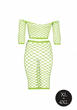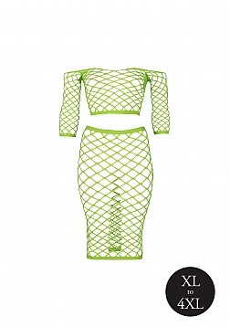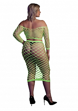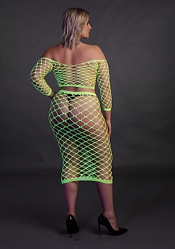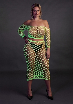 Unleash your inner goddess with this stunning UV activated lingerie. This piece consist of an off shoulder long sleeve crop top and long skirt. An amazing party-wear that gives you that wow-factor and makes you stand out. The UV activated materials adds a touch of mystery and allure. Easy to fit because of the stretchy materials will make you light up the night. Available in neon pink and neon green. Sizes run from XS/ XL to XL/XXXXL
