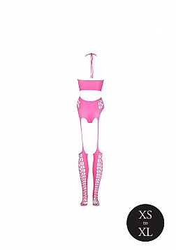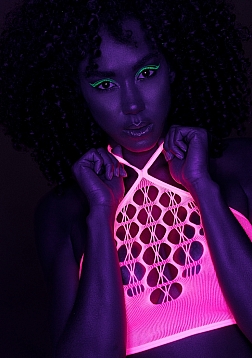 Unleash your inner goddess with this stunning UV activated lingerie. The Grecian neckline gives it that wow-factor and makes you stand out but watch those amazing garter belt stocking that are included. The UV activated materials adds a touch of mystery and allure. Easy to fit because of the stretchy materials will make you light up the night. Available in neon pink and neon green. Sizes run from XS/ XL to XL/XXXXL