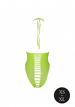 Unleash your inner goddess with this stunning UV activated lingerie. This gorgeous body has a show stopping easy to tie halterneck and a high cut creating the illusion of a smaller waist and rounder hips. The open croutch gives it a little extra playfulness. An amazing party-wear that gives you that wow-factor and makes you stand out. The UV activated materials adds a touch of mystery and allure. Easy to fit because of the stretchy materials will make you light up the night. Available in neon pink and neon green. Sizes run from XS/ XL to XL/XXXXL