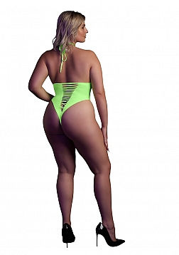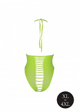 Unleash your inner goddess with this stunning UV activated lingerie. This gorgeous body has a show stopping easy to tie halterneck and a high cut creating the illusion of a smaller waist and rounder hips. The open croutch gives it a little extra playfulness. An amazing party-wear that gives you that wow-factor and makes you stand out. The UV activated materials adds a touch of mystery and allure. Easy to fit because of the stretchy materials will make you light up the night.