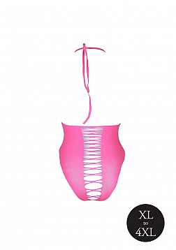 Unleash your inner goddess with this stunning UV activated lingerie. This gorgeous body has a show stopping easy to tie halterneck and a high cut creating the illusion of a smaller waist and rounder hips. The open croutch gives it a little extra playfulness. An amazing party-wear that gives you that wow-factor and makes you stand out. The UV activated materials adds a touch of mystery and allure. Easy to fit because of the stretchy materials will make you light up the night. Available in neon pink and neon green. Sizes run from XS/ XL to XL/XXXXL