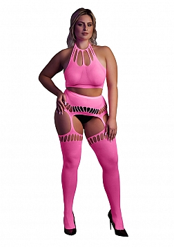Unleash your inner goddess with this stunning UV activated lingerie. This piece consist of a halter neck crop top and garter belt stockings. An amazing party-wear that gives you that wow-factor and makes you stand out. The UV activated materials adds a touch of mystery and allure. Easy to fit because of the stretchy materials will make you light up the night. Available in neon pink and neon green. Sizes run from XS/ XL to XL/XXXXL