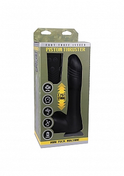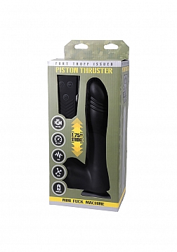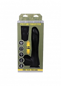 With the Piston Thruster, it's all about the back-and-forth stroke to deliver the real feel of a hard poundin' Top. With a stroke of just under 2 inches, the Piston Thruster nearly matches the stroke of big fuck machines. The super charged engines of the Piston Thruster deliver the power to drive deep. We made sure it's strong enough to penetrate the tightest holes. The mushroom-shaped head is super soft n' cushy, for EZ entry. Controlling this power top is easyÂ… use the remote or the buttons on the balls. You have 2 speeds of fuckin', which offer slightly faster versions of the basic stroke. Unlike traditional fuck machines, ours also offers 8 vibration settings. Powered by a state-of-the art lithium battery, the run time is around 45 minutes. USB rechargeable, and it takes about 1.5 hours to recharge. Made of Premium Liquid Silicone, so you can use any lube. While the Piston Thruster is not whisper quiet, we felt that an engine with a little roar was essential to deliver the thrust that piggy holes crave.