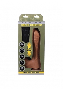 With the Uncut Thruster, it's all about the back-and-forth stroke to deliver the real feel of a hard poundin, uncut Top. With a stroke of just under 2 inches, this thruster nearly matches the stroke of big fuck machines. The super charged engines of the Uncut Thruster deliver the power to drive deep. We made sure it's strong enough to penetrate the tightest holes. The mushroom-shaped head is super soft n' cushy, for EZ entry. Controlling this power top is easyÂ… use the remote or the buttons on the balls. You have 2 speeds of fuckin', which offer slightly faster versions of the basic stroke. Unlike traditional fuck machines, ours also offers 8 vibration settings. Powered by a state-of-the art lithium battery, the run time is around 45 minutes. USB rechargeable, and it takes about 1.5 hours to recharge. Made of Premium Liquid Silicone, so you can use any lube. While the Uncut Thruster is not whisper quiet, we felt that an engine with a little roar was essential to deliver the thrust that piggy holes crave.