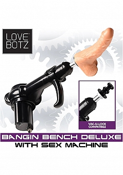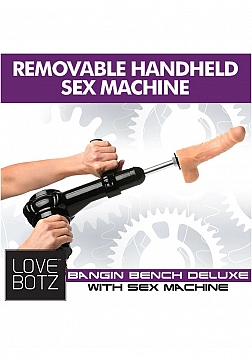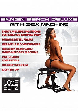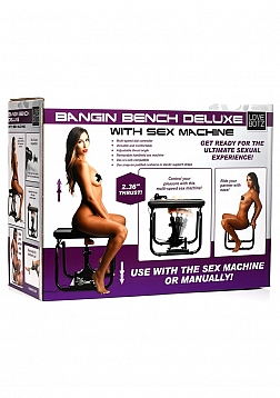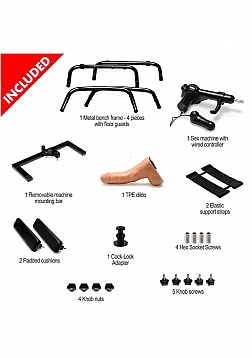 Key Features: Fully Ready to Ride!: This pleasure packed set includes everything you need to set up a sturdy, sexy bench with a sex machine that works perfectly with it! Includes the following: 1 steel bench frame, 1 sex machine, 1 machine mounting bar, 2 padded seats, 2 elastic straps, 1 TPE dildo, 1 Cock-Lock adapter, 4 floor guards, 5 knob screws, 4 knob nuts, 4 hex bolts, 1 controller, 1 power cord, 1 AC/DC adapter. Power and Speed: Control your pleasure with the multi-speed sex machine! Thrusts up to 195 times per minute! Use the controller that connects to the sex machine aand has a multi speed dial for self-controlled intensity. Detachable Machine: The sex machine can be moved and used separately without the bench. Try it on a chair, couch, in doggy-style on the floor or use it manually! For Solo or Couple Play!: Enjoy alone with the machine or your favorite dildo for a self-pleasure session! Invite your partner to watch you get pumped by the machine or remove the machine and use the bench to ride them! Interchangeable Seats: Use the wide, elastic bands to sit and bounce on with your partner or a personal toy. Switch to the flat, plush, padded cushions as seats for when using the sex machine with the bench! The padded cushions are made out of faux leather (PU leather) and are vegan friendly and easy to wipe clean. Variety is the Spice: Enjoy a multitude of positions with the bench and sex machine combo! The machine can be adjusted for different angles so you can get a custom angle that hits your sweet spot! The Bangin' Bench assists in comfortable movement while squatting, bouncing, leaning and grinding! Even without the machine, the bench assists in riding your partner, bouncing on a large dildo that can be placed on the floor, and cunnilingus with your partner's head beneath your bottom just to give you a few ideas!</li> Durable Steel Frame: This durable steel frame can handle up to 220 lbs so you or you can enjoy rough bouncing and pleasure packed riding of the bench and the machine! Corded Power: The sex machine is powered by plugging the cord into an outlet and has a DC24 voltage.