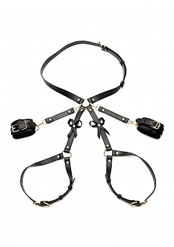 The use of your body is a gift; treat it like one with this bondage harness and wrap up your waist, thighs and wrists like a nice, little package -it even has bows included! Made out of durable PU faux leather, it is vegan friendly and easy to spot clean or wipe clean after each use. The wrist cuffs close using nickel-free, gold colored metal buckles. Adjust the buckles on the thigh straps, waist strap and wrist cuffs for a custom and comfortable fit. Accentuate your curves and make your partner drool with lust and desire as you present yourself as the object of their admiration, a bound and submissive playmate ready to spice up the night!