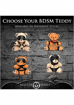 Give this gagged bear as a gag gift or keep it for yourself! The little bondage bear fits in the palm of your hand and will attach to a keychain or bag as a fun way to flag that you're kinky! With a collar, wrist and ankle cuffs and nickel-free chains connecting them, this little bear is restrained for your pleasure and amusement! Made out of polyester, PU faux leather, plastic and nickel-free metal.
