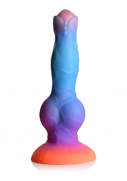 Take your fantasy roleplay, kinky cosplay or creative roleplay further with tangible fantasy toys from Creature Cocks! This Glow-In-The-Dark Alien Dildo might just be the perfect space canine for your carnal pleasures! With a bulging knot at the base, veins popping out along the shaft and a foreskin that has triple beads along the edge, it's also intensely colorful! The psychedelic colors start with the sunburst of reddish orange at the base and continue into purple and blue along the shaft! Embedded in the silicone mold is glitter that shines even more cosmically when the dildo is exposed to sunlight or UV light so that it glows! The wide base provides powerful suction so you can go hands-free by placing it on any flat surface to keep it in place. You can also combine it with a compatible strapon harness for pegging play! Made out of premium, phthalate-free silicone, it has a firm core and soft, silky surface. Use only with water-based lubricants for best results. After play is over, wash the dildo with warm water and soap and use a toy cleaner to spray clean. Wipe dry and store in a cool, dark place out of direct sunlight.