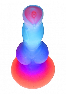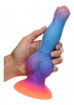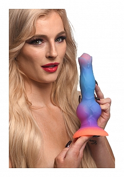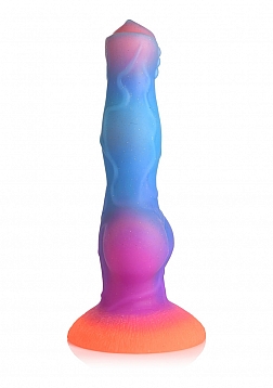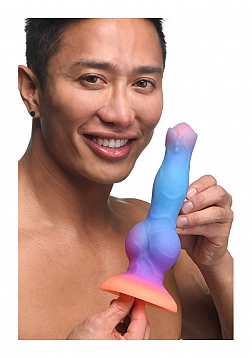 Take your fantasy roleplay, kinky cosplay or creative roleplay further with tangible fantasy toys from Creature Cocks! This Glow-In-The-Dark Alien Dildo might just be the perfect space canine for your carnal pleasures! With a bulging knot at the base, veins popping out along the shaft and a foreskin that has triple beads along the edge, it's also intensely colorful! The psychedelic colors start with the sunburst of reddish orange at the base and continue into purple and blue along the shaft! Embedded in the silicone mold is glitter that shines even more cosmically when the dildo is exposed to sunlight or UV light so that it glows! The wide base provides powerful suction so you can go hands-free by placing it on any flat surface to keep it in place. You can also combine it with a compatible strapon harness for pegging play! Made out of premium, phthalate-free silicone, it has a firm core and soft, silky surface. Use only with water-based lubricants for best results. After play is over, wash the dildo with warm water and soap and use a toy cleaner to spray clean. Wipe dry and store in a cool, dark place out of direct sunlight.
